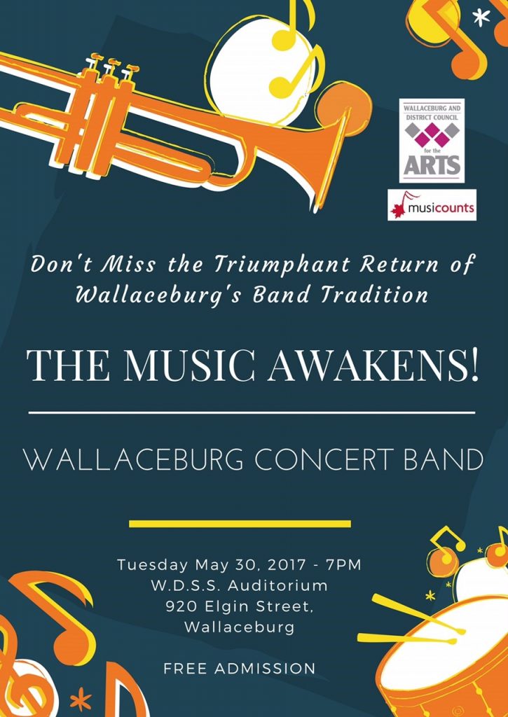 The Wallaceburg Concert Band held its’ first public concert titled “THE MUSIC AWAKENS!” on Tuesday May 30’th, 2017, in the W.D.S.S. Auditorium. Read all about it in the following Sydenham Current, and Wallaceburg Courier Press attached links: