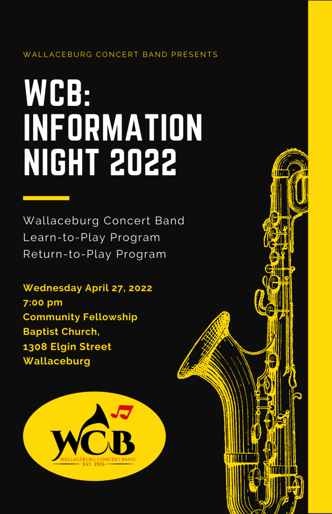If you are interested in joining the Wallaceburg Concert Band this fall, and would like to learn more about our different programs, please join us for an information session Wednesday April 27, 2022.