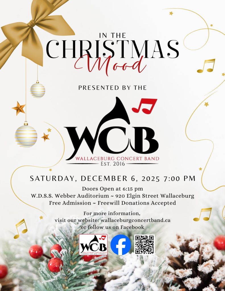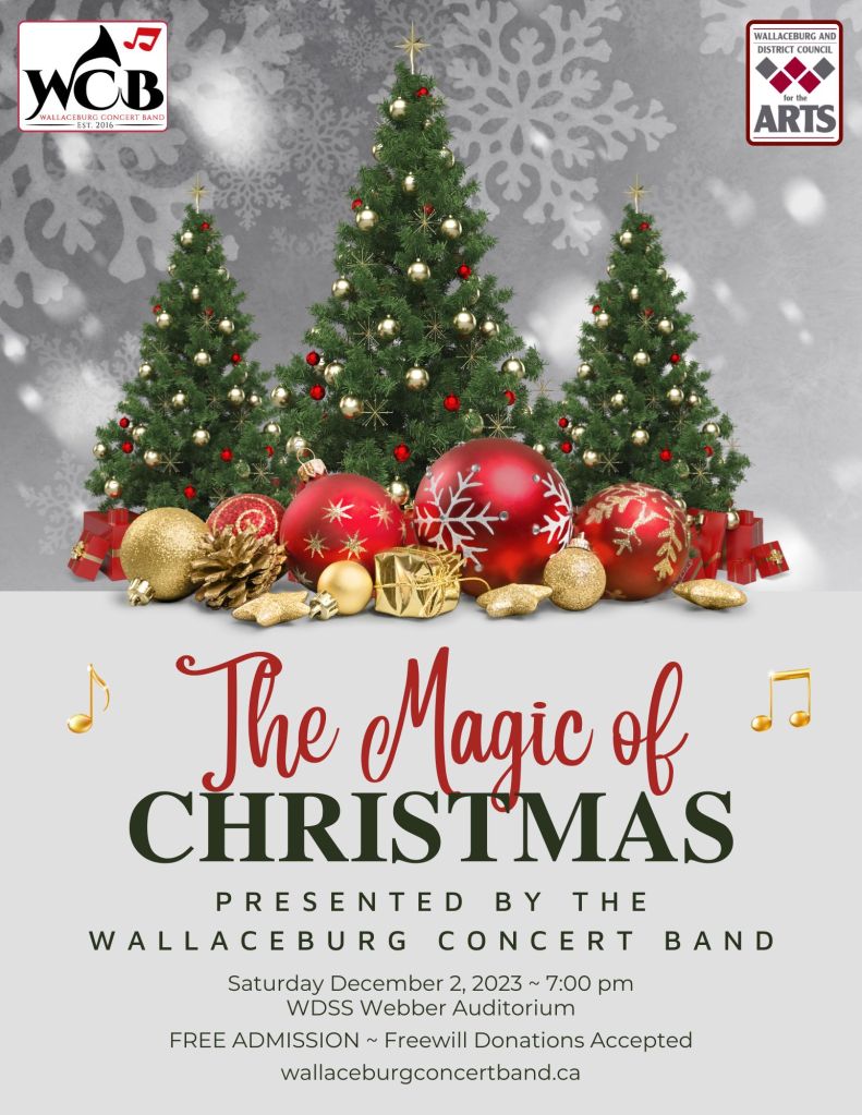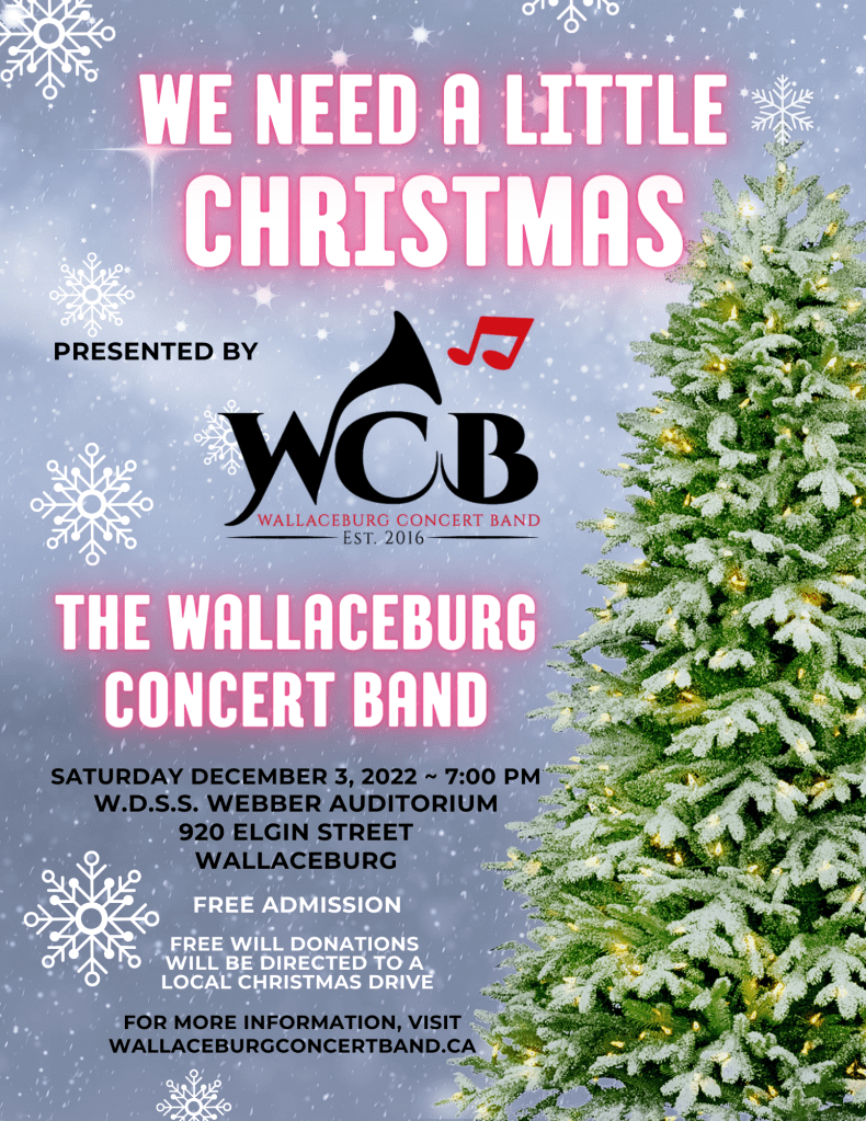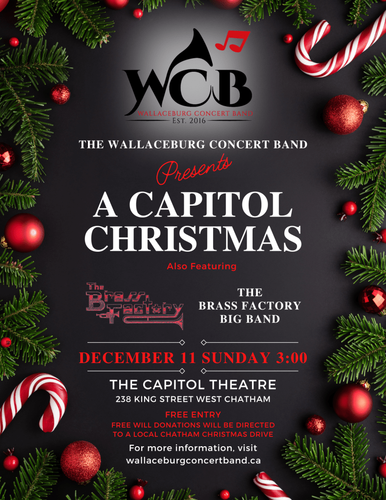We are so very excited to share with you that the Wallaceburg Concert Band will be presenting two Christmas concerts this December. We are hoping you will come out and enjoy the sounds of the season presented by the WCB at either of our two shows, or maybe even both! We are also thrilled to announce that the Brass Factory Big Band will also be featured at our Chatham concert. Mark you calendars and come on out!
