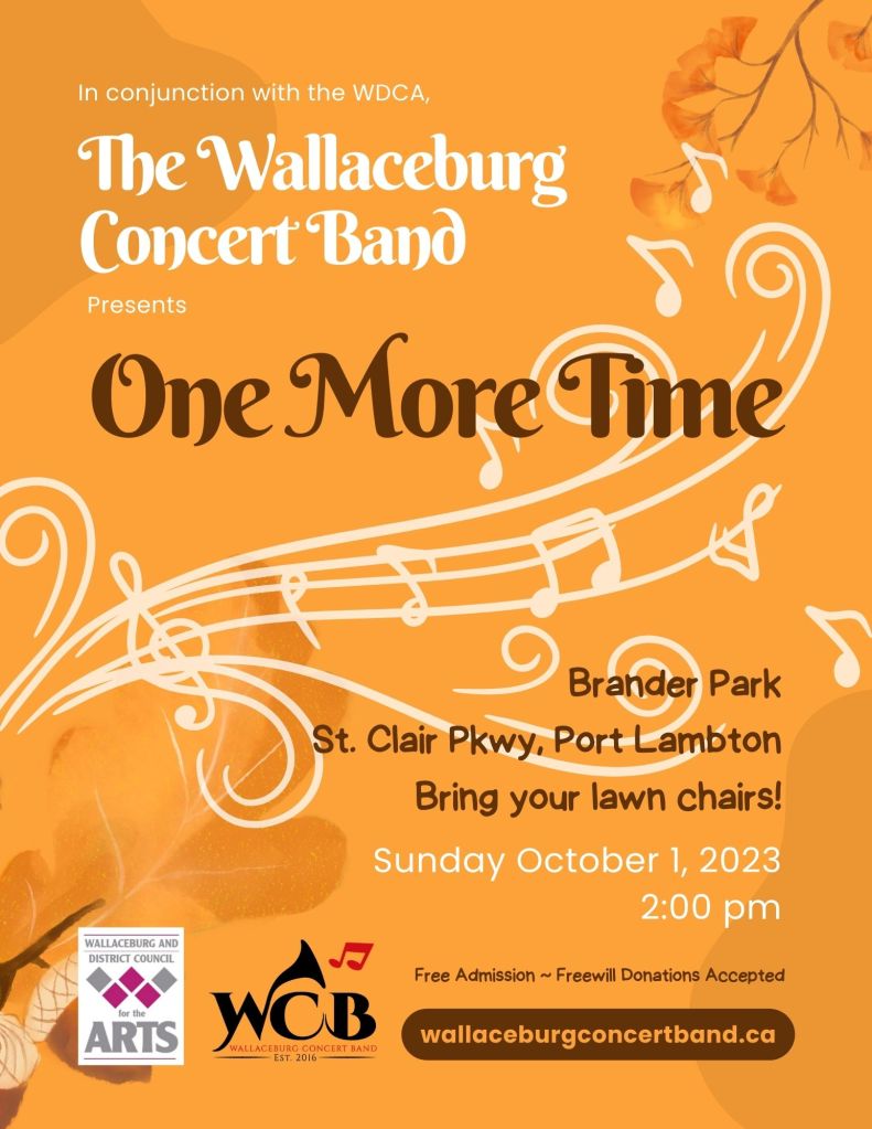 Were you unable to make it out to our May 27, 2023 concert? No need to fret! Come on out to Brander Park on Sunday October 1, 2023. Bring your lawn chair, sit back and relax, and take in the sounds of the Wallaceburg Concert Band as we share much of the May concert music “One More Time,” with a few slight changes. We are hoping to see you there!